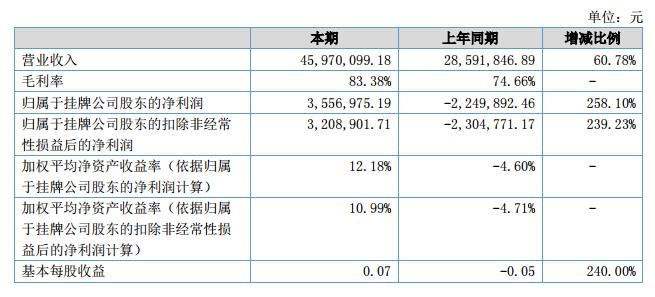 報告期內,公司實現營業(yè)收入45,970,099.18元,相比同期增長60.78%。截至報告期末,公司資產總額68,003,751.68元,較期初減少2.76%;歸屬于母公司所有者權益合計30,977,279.97元,較期初增長12.97%。?