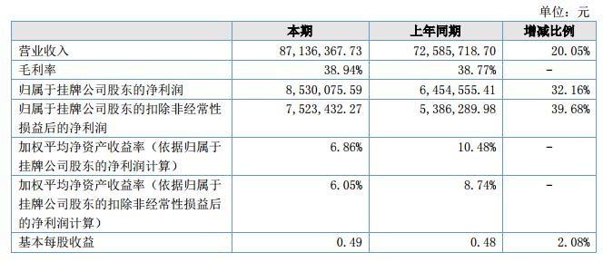 報(bào)告期內(nèi),公司實(shí)現(xiàn)營業(yè)收入87,136,367.73元,較上年同期增長14,550,649.03元,增長比例20.05%;?凈利潤8,530,075.59元,同比增長32.16%。