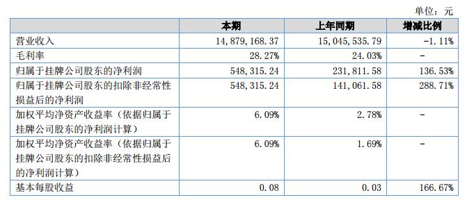 報(bào)告期內(nèi),公司實(shí)現(xiàn)營(yíng)業(yè)收入14,879,168.37元,實(shí)現(xiàn)凈利潤(rùn)548,315.24元,較上年增長(zhǎng)136.53%;毛利率28.27%,較上年同期有所增長(zhǎng)。?