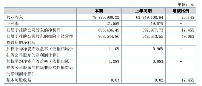 報告期內公司實現(xiàn)營業(yè)收入7,977.70萬元,同比增加1602.79萬元,增幅25.14%;實現(xiàn)歸屬于母公司凈利潤69.64萬元,同比增加10.34萬元,增幅17.45%。?