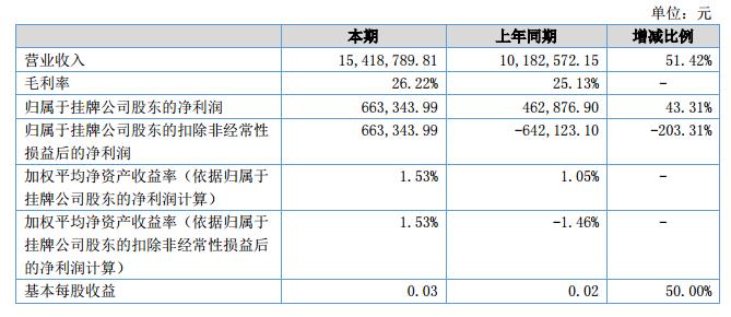 報(bào)告期內(nèi)公司實(shí)現(xiàn)營(yíng)業(yè)收入15,418,789.81元,同期增加51.42%;?凈利潤(rùn)實(shí)現(xiàn)663,343.99元,同期增加41.64%?。