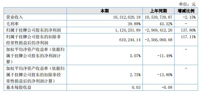 報(bào)告期內(nèi),公司實(shí)現(xiàn)營(yíng)業(yè)收入10,312,620.18元,歸屬母公司凈利潤(rùn)1,124,251.89元,同比增加137.86%?