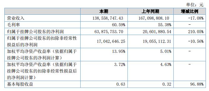 報(bào)告期內(nèi),實(shí)現(xiàn)營業(yè)收入13,855.87萬元,較去年同期減少17.08%;凈利潤6,387.58萬元,比去年同期增加210.05%。?