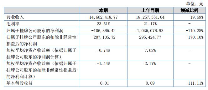 報(bào)告期內(nèi)公司實(shí)現(xiàn)銷售收入1,466.24萬(wàn)元,較上年同期減少19.69%;凈利潤(rùn)-10.64萬(wàn)元,同比減少110.28%。