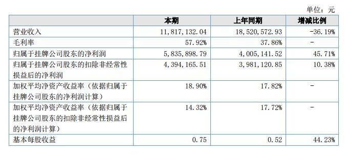 報告期內(nèi)公司實(shí)現(xiàn)營業(yè)收入1,181.71萬元,較上年同期減少36.19%;報告期內(nèi)凈利潤為583.59萬元,比上年同期增長了45.71%。