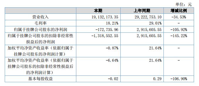 報告期內,公司營業(yè)收入為19,132,173.35元,比去年同期29,222,753.10元相比,下降34.53%;公司凈利潤為-172,735.96元,比去年同期2,915,605.55元下降105.92%。?