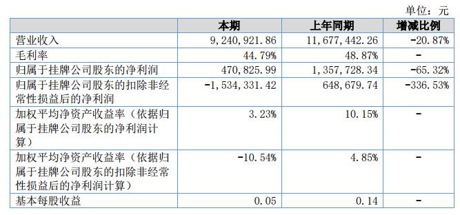 報(bào)告期內(nèi)公司實(shí)現(xiàn)營(yíng)業(yè)收入924.09萬(wàn)元,比2017年同期下降了20.87%;公司實(shí)現(xiàn)凈利潤(rùn)47.08萬(wàn)元,與2017年同期相比,下降了65.32%。?