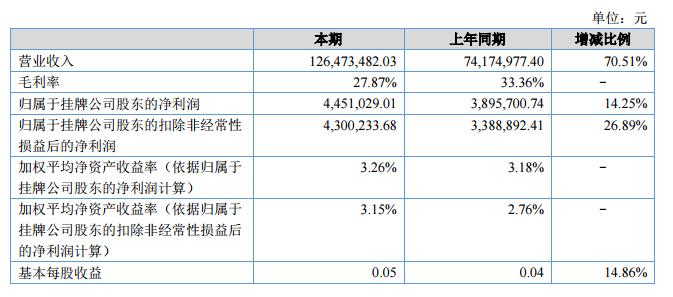 報(bào)告期內(nèi)公司實(shí)現(xiàn)營業(yè)收入12,647.35萬元,較去年同期的7,417.50萬元增加了70.51%;?公司實(shí)現(xiàn)凈利潤4,451,029.01元,同比增長14.25%。