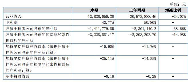 報(bào)告期內(nèi)公司實(shí)現(xiàn)營(yíng)業(yè)收入13,828,050.28元,較上年同期減少-34.07%;凈利潤(rùn)-1,411,779.85元,上年同期為-2,310,169.78元。