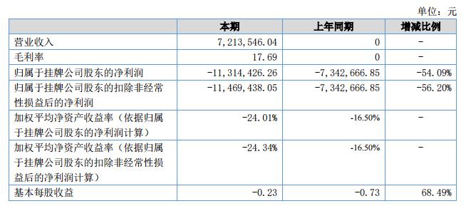 報告期內(nèi),公司2018年上半年實現(xiàn)營業(yè)收入7,213,546.04元,歸屬于母公司的凈利潤為-11,314,426.26元,比上年同期增長-54.09%。?