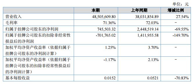 報(bào)告期內(nèi),公司實(shí)現(xiàn)營業(yè)收入4,850.56萬元,同比增長27.54%;公司合并報(bào)表歸屬于母公司的凈利潤為74.55萬元,同比下降69.55%?。