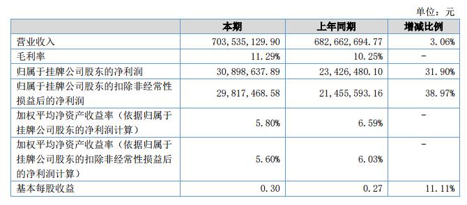 報告期內(nèi),公司實(shí)現(xiàn)營業(yè)收入703,535,129.90元,與去年同期相比增長3.06%;營業(yè)成本624,115,469.39元,與去年同期相比增長1.87%;實(shí)現(xiàn)歸屬于母公司股東的凈利潤30,898,637.89元,與去年同期相比增長31.90%。?
