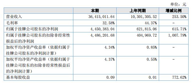 報(bào)告期內(nèi),公司實(shí)現(xiàn)營業(yè)收入36,415,011.64元,比上年同期增加26,113,706.12元,增長率為253.50%;公司實(shí)現(xiàn)營業(yè)利潤5,040,045.10元,比上年同期增加4,352,251.63元,增長比率為632.78%,實(shí)現(xiàn)凈利潤4,450,383.04元,比上年同期增加3,828,567.98元,增長比率為615.71%。