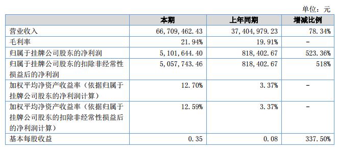 報(bào)告期內(nèi)公司實(shí)現(xiàn)營(yíng)業(yè)收入6670.95萬元,比上年同期增加2930.45萬元,增長(zhǎng)率達(dá)78.34%;報(bào)告期內(nèi)實(shí)現(xiàn)凈利潤(rùn)510.16萬元,比上年同期增加428.32萬元,增長(zhǎng)率523.36%。?