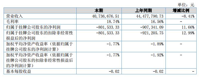 報告期內(nèi)公司實現(xiàn)營業(yè)收入4,073.67萬元,營業(yè)收入增長率-8.41%;銷售毛利率18.74%;資產(chǎn)總計11,698.19萬元,總資產(chǎn)增長率0.81%;歸屬于掛牌公司股東的凈資產(chǎn)4,492.69萬元,與上年同期比降幅1.75%;歸屬于掛牌公司股東的每股凈資產(chǎn)1.14元,與上年同期比降幅1.72%。?