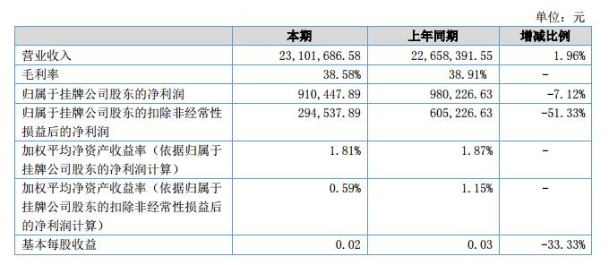 報告期內(nèi)公司實現(xiàn)營業(yè)收入23,101,686.58元,比上年同期增加44.33萬元,同比增加1.96%;凈利潤910,447.89元,比上年同期減少6.98萬元,同比下降7.12%?。