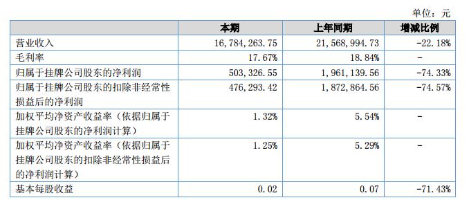 報告期內公司實現(xiàn)營業(yè)收入16,784,263.75元,較去年同期收入21,568,994.73元,下降22.18%;實現(xiàn)凈利潤503,326.55元,較去年同期下降74.33%。
