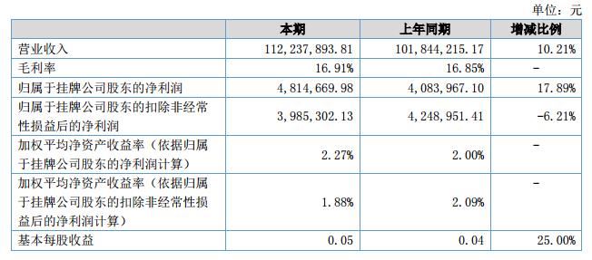 報(bào)告期內(nèi),實(shí)現(xiàn)營(yíng)業(yè)收入112,237,893.81元,凈利潤(rùn)4,814,746.05元,較上年同期營(yíng)業(yè)收入增長(zhǎng)10.21%,凈利潤(rùn)增長(zhǎng)17.89%。?