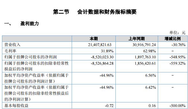 報(bào)告期內(nèi),公司經(jīng)營狀況較差,營業(yè)收入為2140.78萬元,較去年同期下降30.76%;營業(yè)成本為2964.88 萬元,與去年持平;凈利潤為-852.00萬元,較去年同期下降548.95%;毛利率為31.89%,較去年同期大幅下降。