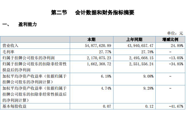 報告期內(nèi),公司實現(xiàn)營業(yè)收入 5,487.76 萬元,同比增加 24.89%。