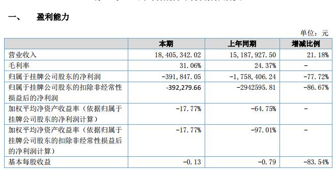 2、經(jīng)營成果狀況:2018 年 6 月 30 日公司實現(xiàn)營業(yè)收入 18,405,342.02 元,比上年同期增加了 3,217,414.52 元,增加了 21.18%;發(fā)生營業(yè)成本 12,687,766.46 元,比上年同期增加了 1,201,051.48 元,增加了 10.46%,主要是公司營業(yè)收入增加,營業(yè)成本也隨之相應(yīng)增加。本期營業(yè)收入毛利率為 31.06%,比上年同期的 24.37%增加了 6.69%;凈利潤為-511,024.56 元,比上年同期減少了 1865203.59 元虧損。