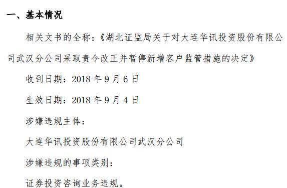 挖貝網(wǎng) 9月9日消息,新三板掛牌公司華訊投資(833924)因證券投資咨詢業(yè)務(wù)違規(guī),湖北證監(jiān)局要求整改并暫停新增客戶。
