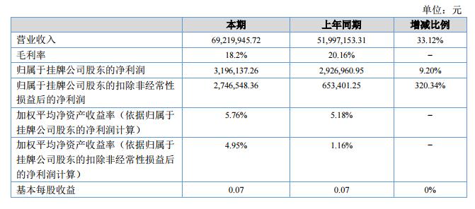 報告期內(nèi)公司實現(xiàn)營業(yè)收入6921.99萬元,同比增長33.12%;本期凈利潤同比增加26.92萬元,同比增幅9.20%。
