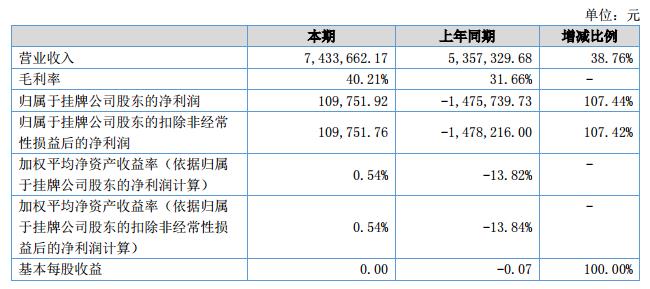 報(bào)告期內(nèi)公司實(shí)現(xiàn)營(yíng)業(yè)收入7,433,662.17元,較上年同期上升了2,076,332.49元,上升比例為38.76%;報(bào)告期實(shí)現(xiàn)凈利潤(rùn)109,751.92元,較上年同期上升了107.44%。