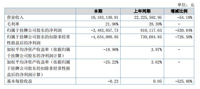 報告期內(nèi)公司實現(xiàn)營業(yè)收入10,183,130.91元,比上年同期下降了54.18%;營業(yè)成本7,947,150.32元,同比上年同期下降了50.07%;凈利潤為-3,483,857.73元,同比上年同期下降了530.04%。?