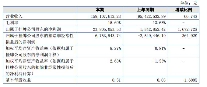 報告期內公司實現(xiàn)營業(yè)收入15,910.76萬元,比上年同期增長了66.74%。實現(xiàn)凈利潤2,380.51萬元,較去年同期增長了1,672.72%。?