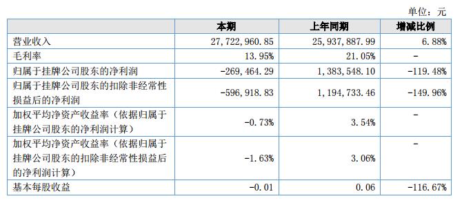 報告期內,公司實現(xiàn)營業(yè)收入2,772.30萬元,同比增長6.88%;毛利率13.95%,較上年同期的21.05%下降7.10%;凈利潤-173.61萬元,同比下降227.76%;歸屬于母公司所有者的凈利潤-26.95萬元,同比下降119.48%。?