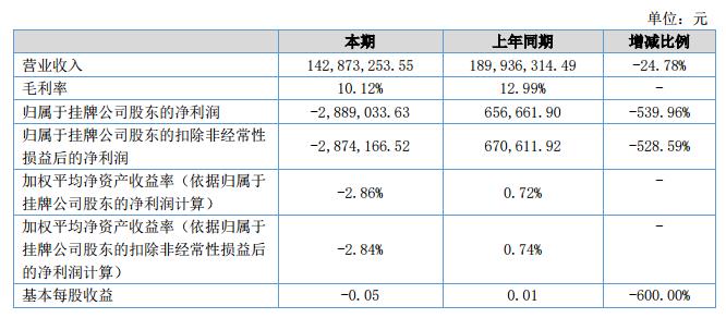公司在報(bào)告期內(nèi)的營業(yè)收入為142,873,253.55元,比去年同期降低了24.78%。營業(yè)成本為128,409,994.16元,比去年同期降低了22.30%。歸屬于母公司所有者的凈利潤為-2,889,033.63元,比去年同期增虧3,545,695.53元。?
