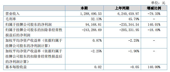 報告期內(nèi)公司實(shí)現(xiàn)營業(yè)收入1,288,490.53元,較上年同期減少79.35%;與此同時營業(yè)成本874,393.02元,較上年同期減少74.15%;報告期內(nèi)毛利率32.13%,上年同期45.79,毛利率同比下降13.66%;實(shí)現(xiàn)凈利潤94,168.81元,較上年同期增加近33萬。?