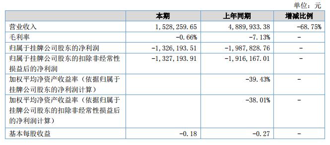 報告期內(nèi),公司營業(yè)收入為152.83萬元,同比上期下降了68.75%;報告期公司凈利潤為-132.62萬元,同比上期減少虧損33.28%。?