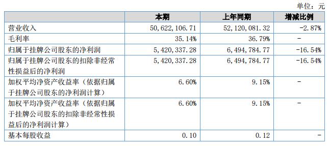 報告期內(nèi)公司實(shí)現(xiàn)營業(yè)收入5062.21萬元,與上年同期相比減2.87%;公司的營業(yè)總成本4339.50萬元,和去年同期相比減少0.21%;公司的凈利潤為542.03萬元,和去年同期相比減少16.54%。