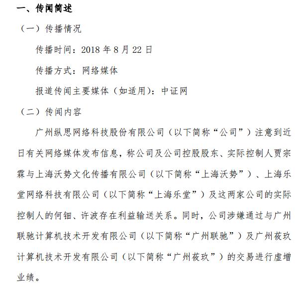公告顯示,廣州縱思網(wǎng)絡(luò)科技股份有限公司(以下簡稱“公司”)注意到近日有關(guān)網(wǎng)絡(luò)媒體發(fā)布信息,稱公司及公司控股股東、實際控制人賈宗霖與上海沃勢文化傳播有限公司(以下簡稱“上海沃勢”)、上海樂堂網(wǎng)絡(luò)科技有限公司(以下簡稱“上海樂堂”)及這兩家公司的實際 控制人的何鈿、許波存在利益輸送關(guān)系。同時,公司涉嫌通過與廣州 聯(lián)馳計算機(jī)技術(shù)開發(fā)有限公司(以下簡稱“廣州聯(lián)馳”)及廣州莜玖計算機(jī)技術(shù)開發(fā)有限公司(以下簡稱“廣州莜玖”)的交易進(jìn)行虛增業(yè)績。