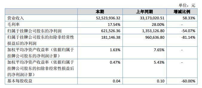 報(bào)告期內(nèi),公司實(shí)現(xiàn)營(yíng)業(yè)收入5,252.39萬(wàn)元,同比增長(zhǎng)58.33%,實(shí)現(xiàn)凈利潤(rùn)62.15萬(wàn)元,同比減少54.07%。資產(chǎn)總額5,396.52萬(wàn)元,比上年度末增長(zhǎng)1.11%,凈資產(chǎn)3,854.95萬(wàn)元。?