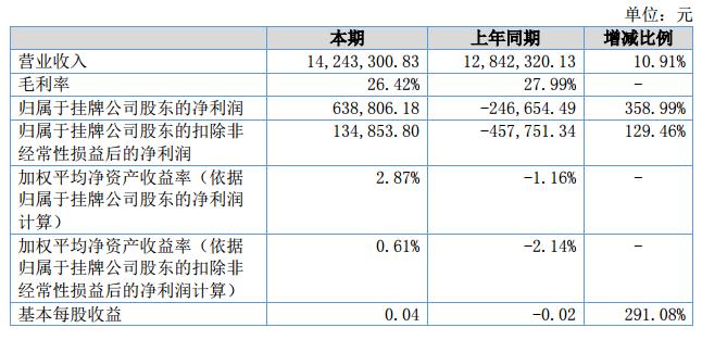 報(bào)告期實(shí)現(xiàn)營(yíng)業(yè)收入14,243,300.83元,較上期上升10.91%;報(bào)告期實(shí)現(xiàn)利潤(rùn)總額663,650.50元,較上期上升443.99%,凈利潤(rùn)638,806.18元,較上期上升358.99%。