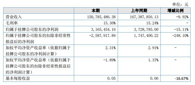 報告期內(nèi),公司實現(xiàn)營業(yè)收入15,078.54萬元,較上年同期下降9.92%;公司凈利潤316.54萬元,較上年同期下降15.11%。?
