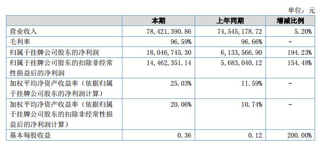 報(bào)告期內(nèi)公司實(shí)現(xiàn)營(yíng)業(yè)收入7842.14萬(wàn)元,同比增長(zhǎng)5.20%;實(shí)現(xiàn)歸屬于掛牌公司股東的凈利潤(rùn)1804.67萬(wàn)元,同比增長(zhǎng)194.23%。