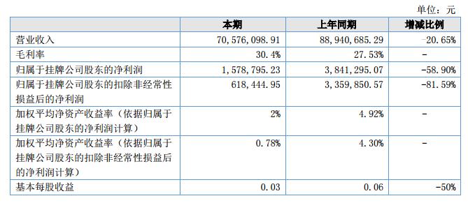 2018年上半年,營(yíng)業(yè)收入為70,576,098.91元,與上年同期相比下降20.65%;營(yíng)業(yè)成本為49,102,374.24元,與上年同期相比下降23.82%;凈利潤(rùn)為1,578,795.23元,與上年同期相比下降58.90%。