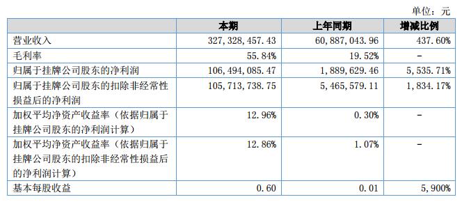 報(bào)告期內(nèi),公司實(shí)現(xiàn)營(yíng)業(yè)收入327,328,457.43元,同比增加437.60%;營(yíng)業(yè)成本為144,539,431.64元,較去年同期增加194.96%,毛利率為55.84%,較去年同期上升36.32%;凈利潤(rùn)為106,494,085.47元,較去年同期增加5,535.71%。