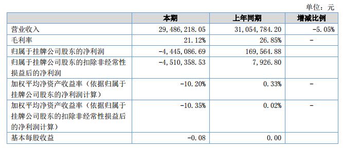 報告期內(nèi),公司實現(xiàn)營業(yè)收入2,948.62萬元,較上年同期的3,105.48萬元減少了156.86萬元,減幅5.05%;本期產(chǎn)品毛利率21.12%,與上年同期的26.85%減少了5.73%;本期實現(xiàn)凈利潤-444.51萬元。?