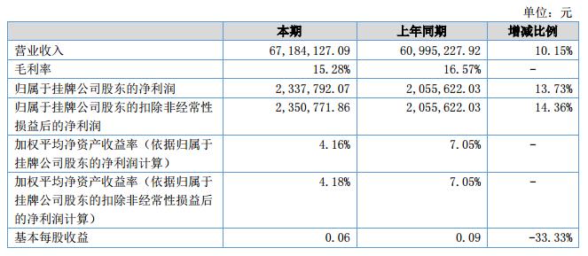 報(bào)告期內(nèi),公司實(shí)現(xiàn)營(yíng)業(yè)收入67,184,127.09元,較上年同期增長(zhǎng)了10.15%;實(shí)現(xiàn)歸屬于母公司股東的凈利潤(rùn)2,337,792.07元,較上年同期增長(zhǎng)13.73%;經(jīng)營(yíng)活動(dòng)現(xiàn)金流量?jī)纛~5,082,300.06元,較上年同期增長(zhǎng)137.91%;截至本報(bào)告期末,公司資產(chǎn)總額為93,040,020.61元,較上年末的98,964,358.50元下降5.99%。?