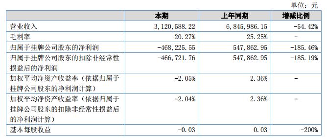 報(bào)告期內(nèi),公司實(shí)現(xiàn)營(yíng)業(yè)收入3120588.22元,同比下降54.42%;營(yíng)業(yè)成本2488024.50元,同比下降51.38%;凈利潤(rùn)-468225.55元,同比下降185.19%。?