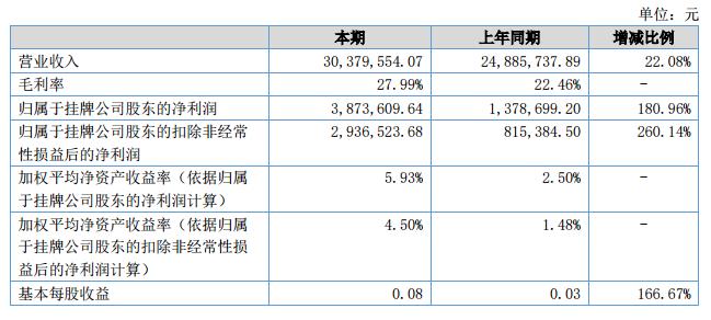 報(bào)告期內(nèi),公司實(shí)現(xiàn)營(yíng)業(yè)收入30,379,554.07元,同比增長(zhǎng)22.08%,實(shí)現(xiàn)歸屬于掛牌公司股東的凈利潤(rùn)3,873,609.64元,同比增長(zhǎng)180.96%。公司營(yíng)業(yè)收入、凈利潤(rùn)的增加,得益于公司積極拓展主營(yíng)業(yè)務(wù)。報(bào)告期末,公司資產(chǎn)總額165,608,479.24元,同比增長(zhǎng)20.16%,歸屬于掛牌公司股東的凈資產(chǎn)總額為67,245,572.85元,同比增長(zhǎng)6.11%,主要系公司收入增加,盈利水平提高所致。?