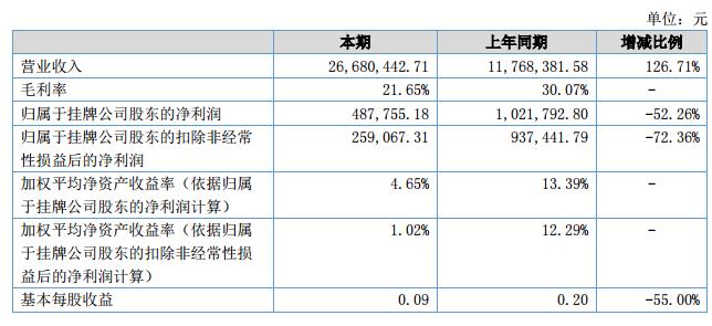 公司實現(xiàn)的營業(yè)收入為26,680,442.71元,較上年同期增加14,912,061.13元;截至報告期末,公司的營業(yè)成本為20,902,843.63元,較上年同期增加12,672,889.40元;報告期內(nèi)公司管理費用為4,337,655.47元,較上年同期增加了2,531,186.04元;報告期內(nèi),公司凈利潤487,755.18元,較上年同期減少了534,037.62元。