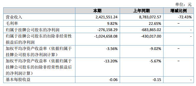 報(bào)告期內(nèi),公司主營(yíng)業(yè)務(wù)收入2,421,551.24元,同比下降72.43%;實(shí)現(xiàn)凈利潤(rùn)-276,158.29元,去年同期利潤(rùn)-683,865.02元,同比增長(zhǎng)59.62%。?