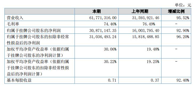 報(bào)告期內(nèi),公司實(shí)現(xiàn)營業(yè)收入6,177.13萬元,與上年同期相比增長95.52%;凈利潤方面:報(bào)告期內(nèi)公司實(shí)現(xiàn)凈利潤3,087.11萬元,較去年同期1,600.38萬元增長92.90%。?