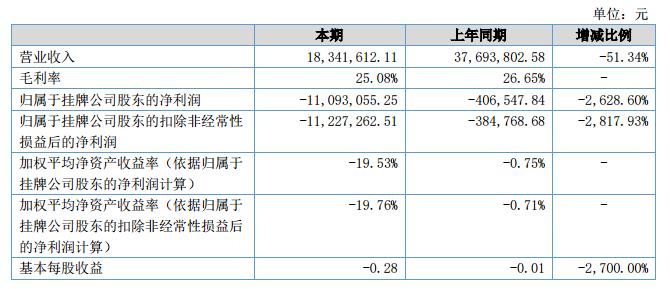 報(bào)告期內(nèi)公司總收入為18,341,612.11元,比上年同期減少51.34%;凈利潤為-11,093,055.25元,比上年同期增加虧損10,686,507.41萬元;總資產(chǎn)為107,110,649.04元,比期初減少14.53%;凈資產(chǎn)為35,260,737.10元,比期初減少43.45%;公司2018年上半年毛利率比去年同期稍有下降,為25.08%?。